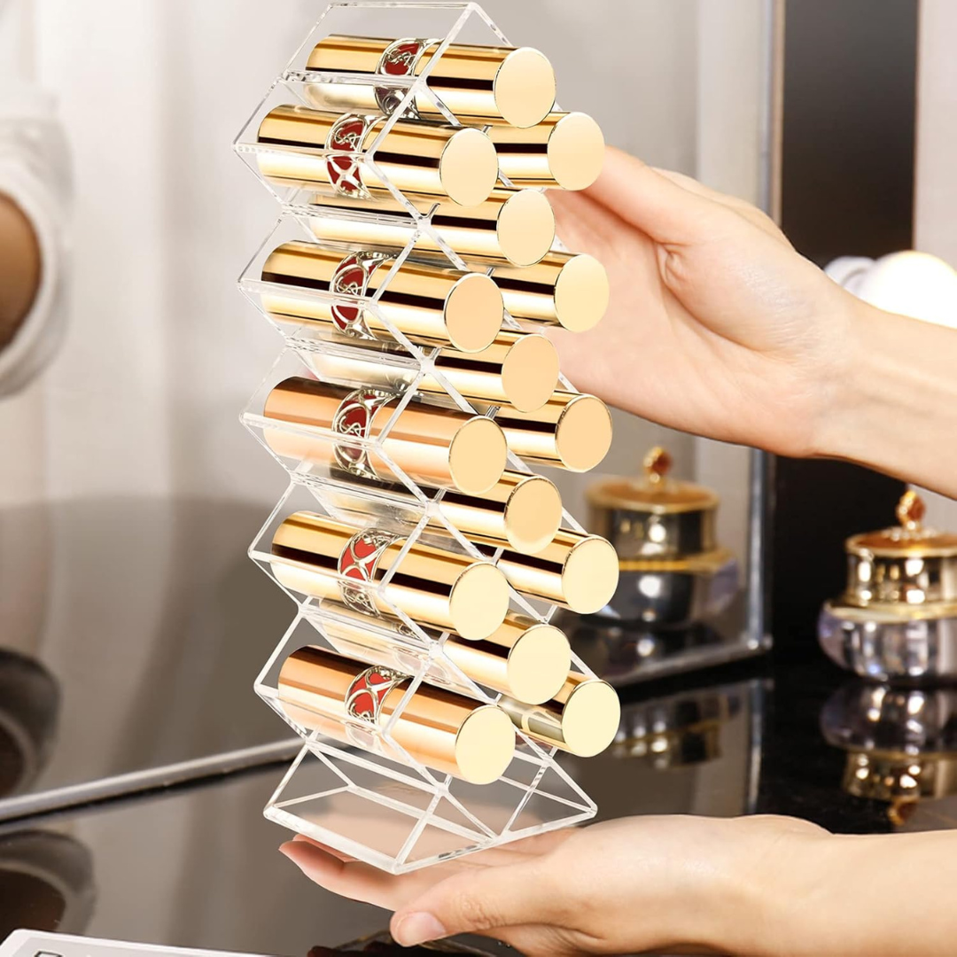 Elevate your vanity and organize your beauty collection with the LuxeStack Lipstick Organizer – the ultimate fusion of functionality and glam for makeup lovers who value both style and structure.